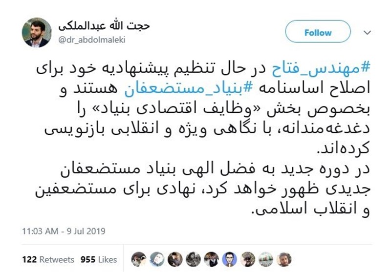 عبدالملکی معاون توسعه اشتغال کمیته امداد، با انتشار پستی تلویحا با تأیید این اخبار، از تحول در دوره جدید این بنیاد خبر داد و گفت: مهندس فتاح در حال تنظیم پیشنهادیه خود برای اصلاح اساسنامه بنیاد مستضعفان هستند و بخصوص بخش «وظایف اقتصادی بنیاد» را دغدغهمندانه، با نگاهی ویژه و انقلابی بازنویسی کردهاند. در دوره جدید به فضل الهی بنیاد مستضعفان جدیدی ظهور خواهد کرد، نهادی برای مستضعفین و انقلاب اسلامی.
