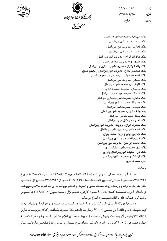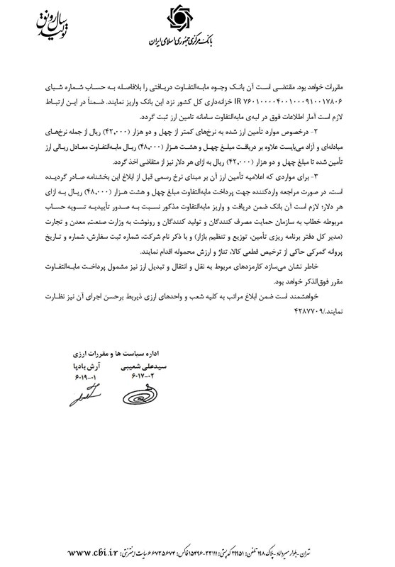 1- در مواردی که تامین ارز بابت گشایش اعتبار اسنادی، ثبت برات اسنادی و حواله ارزی برای واردات کره، حبوبات، چای و کاغذ با نرخ رسمی 4200 تومانی به ازای هر دلار، صورت پذیرفته و کالای مربوطه تا تاریخ 18 خرداد امسال ترخیص نشده است، پذیرش اسناد حمل مربوطه و صدور اعلامیه تامین ارز، منوط به دریافت مبلغ 48 هزار ریال به ازای هر دلار بر مبنای نرخ روز تبدیل ارز از متقاضی با رعایت سایر مقررات خواهد بود. مقتضی است آن بانک وجوه مابهالتفاوت دریافتی را بلافاصله به حساب شماره شبای خزانهدار کل کشور نزد این بانک واریز کند. ضمنا در این ارتباط لازم است امار اطلاعات فوق در لبه مابهالتفاوت سامانه تامین ارز ثبت شود.