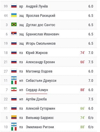 خبرگزاری ورزشی چمپیونات روسیه نیز با مشارکت کاربرانش نمره فنی متوسط 6 را به بازی سردار آزمون اختصاص داد. الکساندر اروخین با دریافت نمره 7.5 بهترین بازیکن تیم زنیت بود.