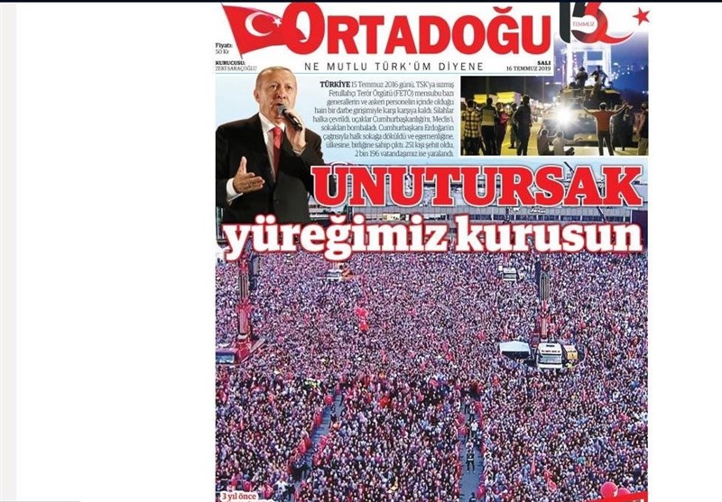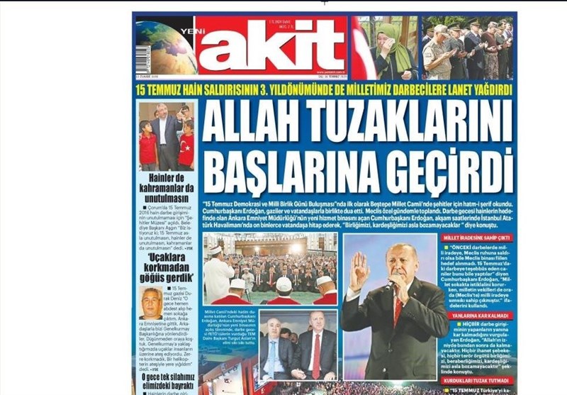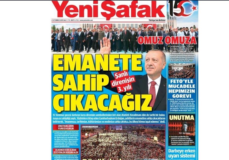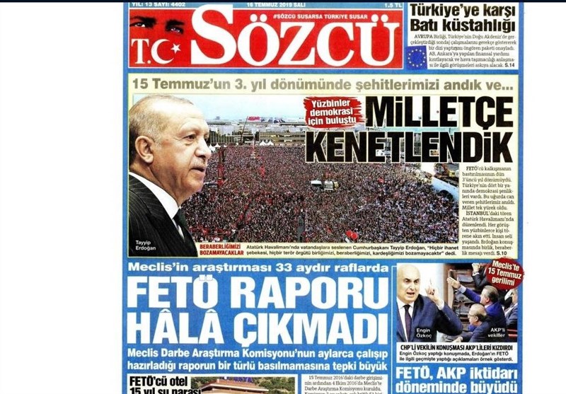 به گزارش گروه بین‌الملل خبرگزرای تسنیم، بسیاری از روزنامه‌های ترکیه، امروز در عکس و تیتر صفحه نخست، سخنرانی اردوغان در مراسم سومین سالگرد کودتای نافرجام را برجسته کرده‌اند.