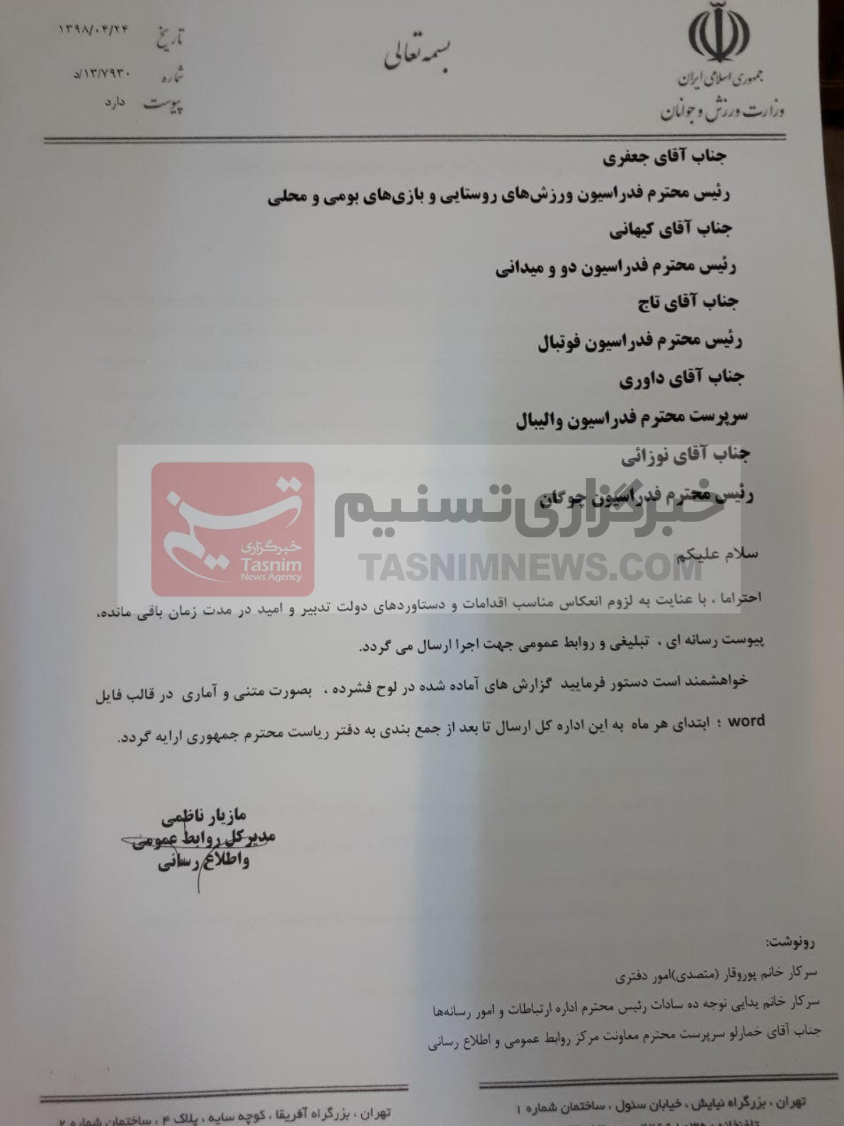 به گزارش خبرنگار ورزشی خبرگزاری تسنیم، وزارت ورزش و جوانان روز گذشته (دوشنبه) نامهای را با امضای مازیار ناظمی مدیرکل روابط عمومی و اطلاع رسانی به فدراسیونهای ورزشی ارسال کرده که دارای محتوای خاص و قابل تأملی است.
