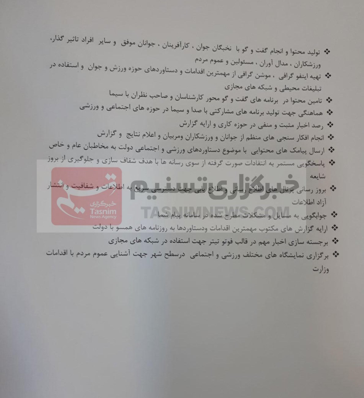 موضوع اصلی ذکر شده در این نامه لزوم انعکاس مناسب اقدامات و دستاوردها در مدت زمان باقیمانده از دولت دوازدهم یعنی تا سال 1400 و هماهنگی فدراسیونها برای انجام کار در این حوزه است.