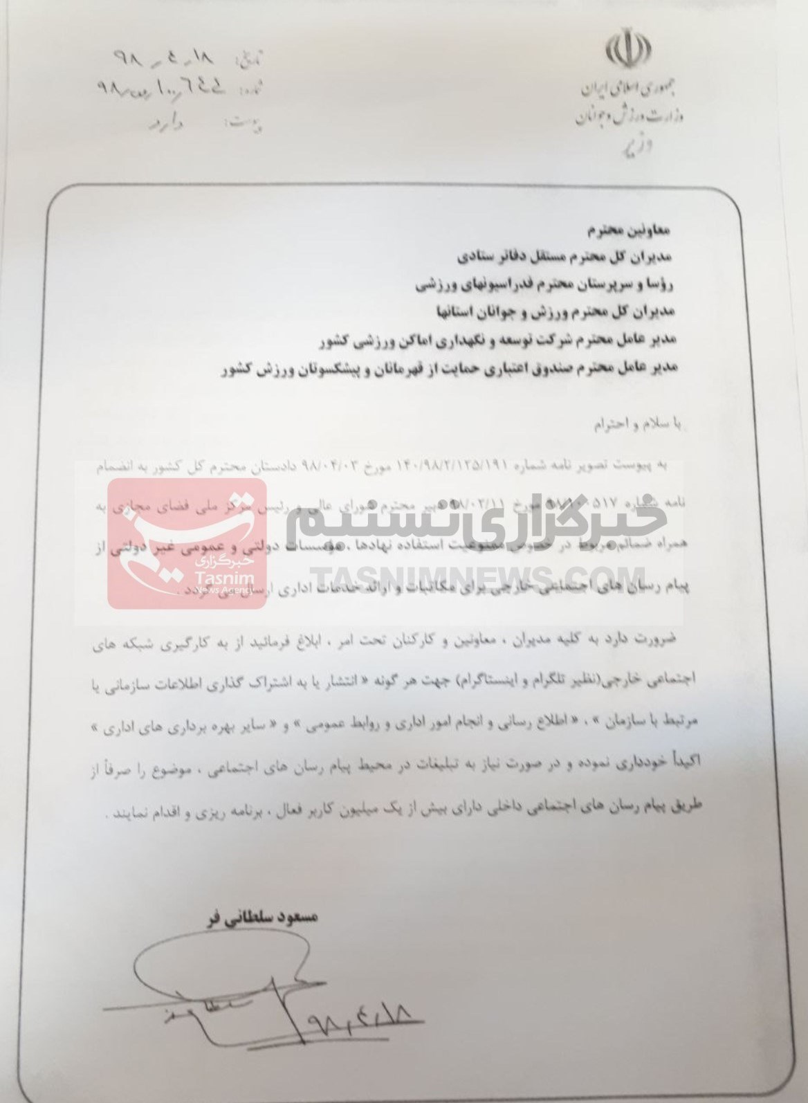 تصاویر نامه وزارت ورزش به فدراسیونها و البته نامه سلطانیفر در زیر آمده است: