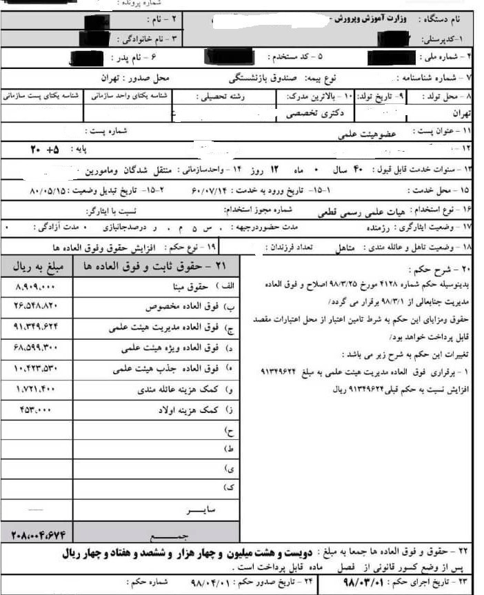 در ذیل، حکم کارگزینی این فرد و حقوق 20 میلیون تومانی او را البته بدون احتساب اضافه کار، مشاهده میکنید: