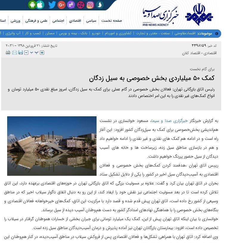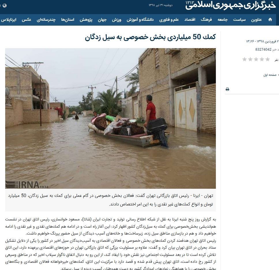 کمک 50 میلیارد تومانی اعضای اتاق بازرگانی تهران و بخش خصوصی حاضر در این نشست به سیلزدگان کشور از سوی رسانههای رسمی در حالی اعلام شد که تا آن روز کل کمکهای نقدی مردم ایران به هلال احمر چیزی کمتر از 130 میلیارد تومان بود و این یعنی ورود بخش خصوصی برای جبران خسارتهای واردشده به سیلزدگان با تمام قدرت.