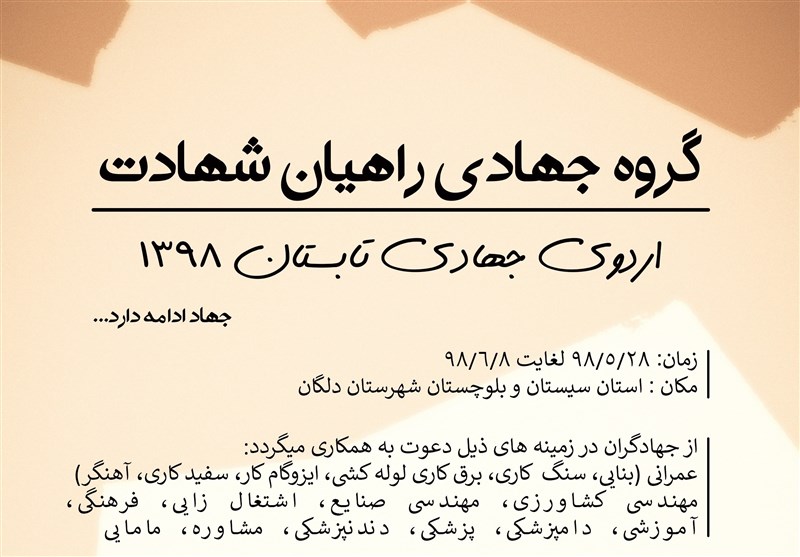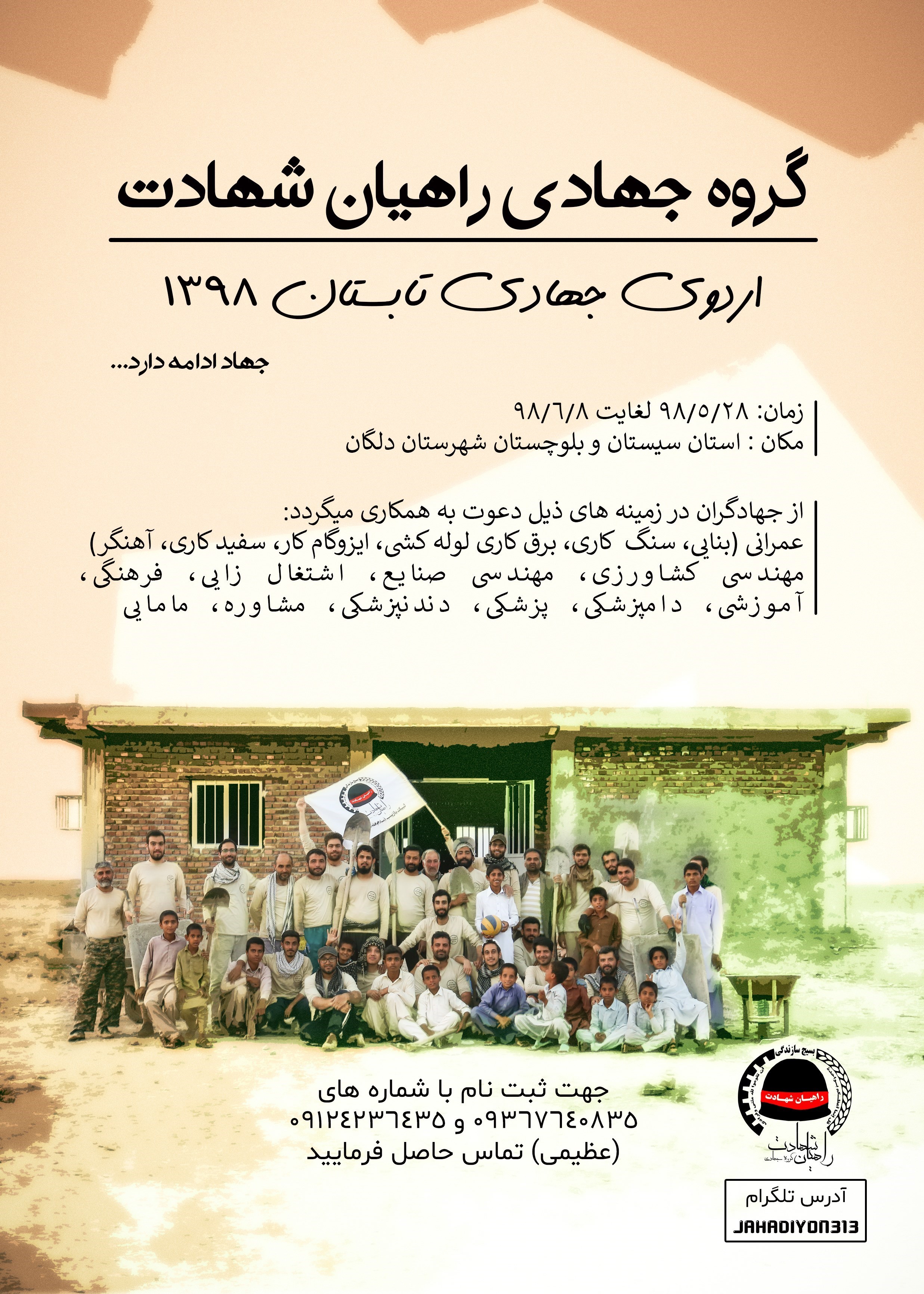 به گزارش خبرنگار فرهنگی باشگاه خبرنگاران پویا, گروه جهادی راهیان شهادت از علاقهمندان به شرکت در اردوهای جهادی در زمینههای عمرانی (بنّا، سنگکار، ایزوگامکار، برقکار، آهنگر، سفیدکار، لولهکش و...)، پزشکی، دندانپزشکی، دامپزشکی، مهندسی کشاورزی، مهندسی صنایع، کارآفرین، اشتغالزایی، فرهنگی و آموزشی در راستای تکمیل مدرسه حضرت رقیه(س) و رفع آسیبهای اجتماعی شهرستان دلگان سیستان و بلوچستان ثبتنام بهعمل میآورد.