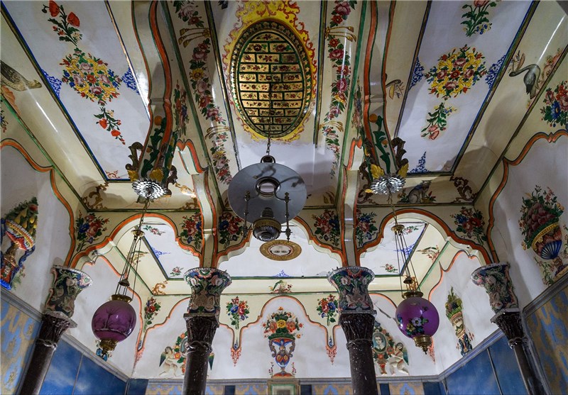 اما شاید از همه اینها دیدنیتر، نقاشیهای خوشرنگ و لعابی باشد که در گوشه به گوشه سالنها و اتاقها میبینید و هر کدام متناسب با فضای سیاسی، فرهنگی و اجتماعی آن دوران کشیدهاند بخشی از نقاشیهای روی سقف اتاق ناهار خوری پذیرایی از میهمانان مختلف ایرانی و فرنگی متناسب با فرهنگ هر یک به تصویر کشیده است سفره ایرانی با چلو کباب و میز پذیرایی فرنگی با انواعی از خوراکیها و نوشیدنیهای متنوع است.