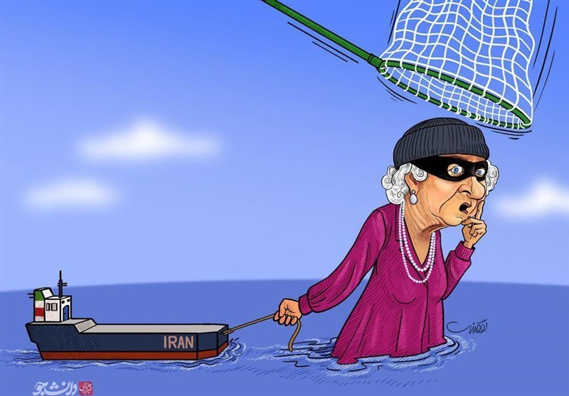 وی ادامه داد: اثر دوم من مستقیما به نام این نمایشگاه که «ملکه کشتی ربا» است، ارتباط دارد. در این اثر، ملکه انگلیس را میبینیم؛ در حالی که نقاب دزدان را به چشمش زده، مشغول حمل نفتکش ایران است اما از بالا در دام تور نیروهای سپاه پاسداران انقلاب اسلامی افتاده است.