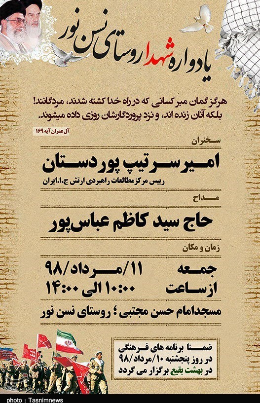 به گزارش خبرگزاری تسنیم از نور، مراسم بزرگداشت 13 شهید روستای نسن از توابع شهرستان نور مازندران برای سیوهشتمین سال متوالی همزمان با شهادت حضرت جواد الائمه(ع) در 11 مرداد ماه 1398 با حضورمردم ولایتمدار آن دیار برگزار میشود.