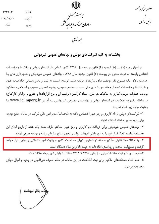 بر این اساس تمامی شرکتهای دولتی، بانکها و موسسات انتفاعی وابسته به دولت، نهادهای عمومی غیر دولتی و شهرداریهای با جمعیت بالای یک میلیون نفر موظفاند برای سالهای برنامه ششم توسعه نسبت به ثبت و به روزرسانی اطلاعات خود و شرکتها و موسسات تابعه از جمله صورتهای مالی مصوب مجمع عمومی، بودجه تفضیلی مصوب و اصلاحی، عملکرد بودجه، اعتبارات سرمایه گذاری به تفکیک هر طرح در سامانه یکپارچه اطلاعات شرکتهای دولتی مکلف شدند.