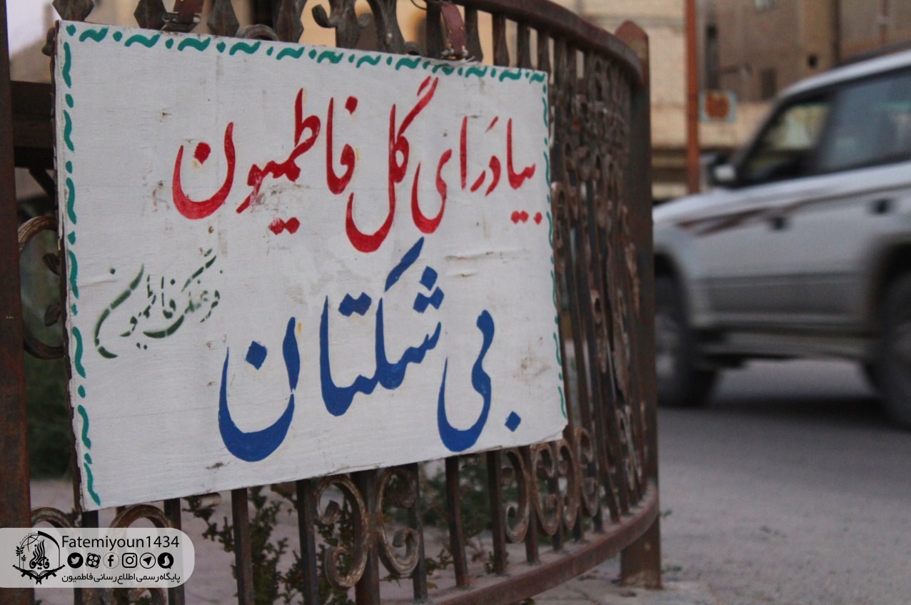 یکی از تابلو نوشتههای جالب واحد فرهنگی فاطمیون با لهجه افغانستانی در گوشهای از شهر پالمیرا (تدمر) سوریه که بر روی آن نوشته: یادرای گل فاطمیون بی شکتان (برداران فاطمیون، دمتون گرم)