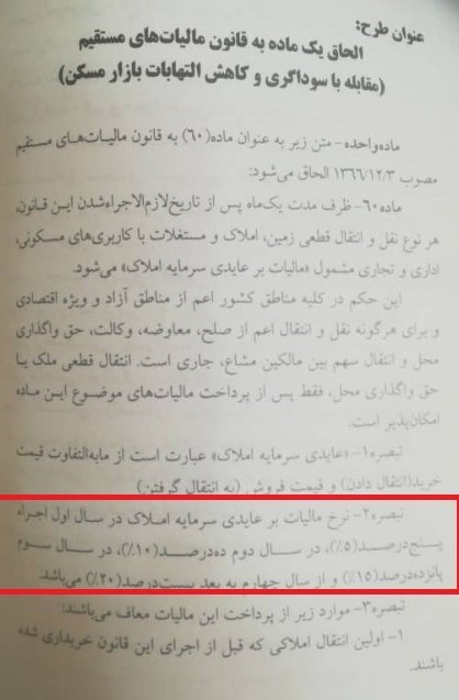 تبصره 2- نرخ این مالیات در سال اول اجرا 5 درصد، در سال دوم 10 درصد، در سال سوم 15 درصد و از سال چهارم به بعد 20 درصد عایدی ملک خواهد بود.