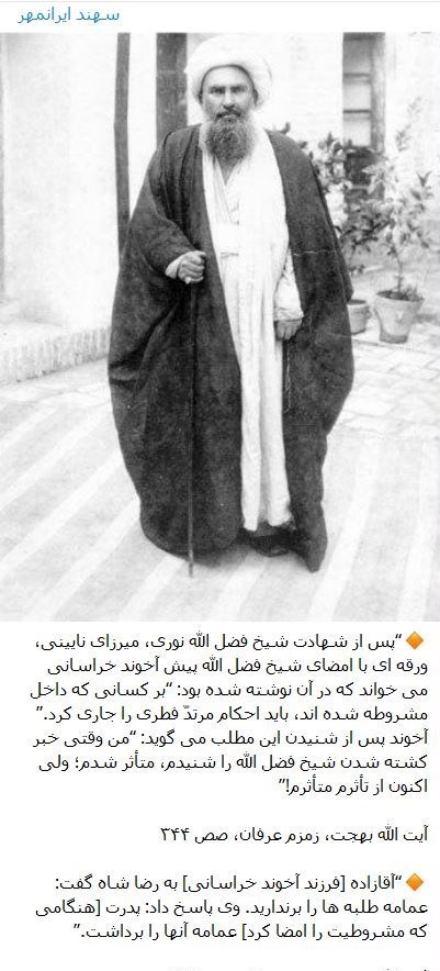 در روزهای گذشته مطلبی به نقل از آیت‌الله بهجت در برخی کانال‌هال تلگرامی درباره شیخ فضل‌الله نوری پخش شد. متن منسوب به آیت‌الله بهجت چنین بود "پس از شهادت شیخ فضل الله نوری، میرزای نایینی، ورقه ای با امضای شیخ فضل الله پیش آخوند خراسانی می‌خواند که در آن نوشته شده بود: "بر کسانی که داخل مشروطه شده‌اند، باید احکام مرتدّ فطری را جاری کرد." آخوند پس از شنیدن این مطلب می‌گوید: من وقتی خبر کشته شدن شیخ فضل الله را شنیدم، متأثر شدم؛ ولی اکنون از تأثرم متأثرم!