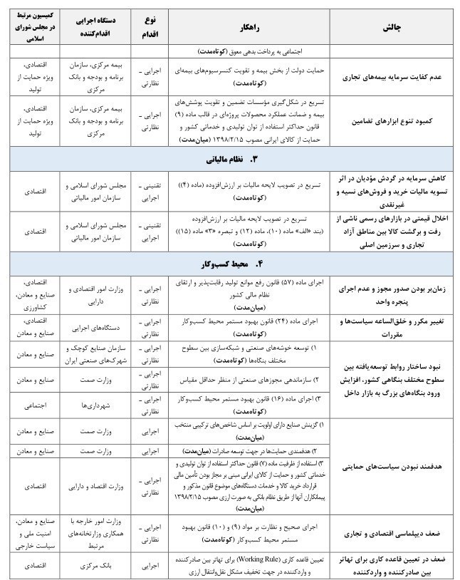 از جمله چالشهای کلان برون بنگاهی بخش صنعت میتوان به تأمین مالی و نقدینگی واحدها توسط بانکها و بازار سرمایه، وجود مقررات و تفسیرهای متعدد و شفاف نبودن فرایند رسیدگی به شکایات در نظام بیمه ای کشور، مشکلات ناشی از اجرای قانون مالیات بر ارزش افزوده و گسترده نبودن پایه های مالیاتی در کشور اشاره کرد. از طرفی، زمانبر بودن صدور مجوز و عدم اجرای پنجره واحد ،تغییر مکرر و خلق الساعه سیاستها و مقررات، نبود ساختار روابط توسعه یافته بین سطوح مختلف بنگاهی کشور، ضعف دیپلماسی اقتصادی و تجاری و سودآوری و رواج فعالیتهای غیرمولد و سوداگرانه در اقتصاد کشور از جمله چالشهای اصلی محیط کسب وکار به شمار می آیند .جهش نرخ ارز و عدم ثبات آن موجب بی ثباتی در قیمت مواد اولیه و افزایش هزینه های تولید، خسارت به پیمانکاران بخش خصوصی، کمبود ارز با نرخ نیمایی و استفاده بی رویه و ناصحیح از کارتهای بازرگانی شده است. تعیین ارزش کالاها در سامانه تعیین ارزش گمرکی کالا TSC و زمانبر شدن فرایند ترخیص محموله های وارداتی نیز از جمله چالشهای بخش صنعت در امور گمرکی محسوب میشود .