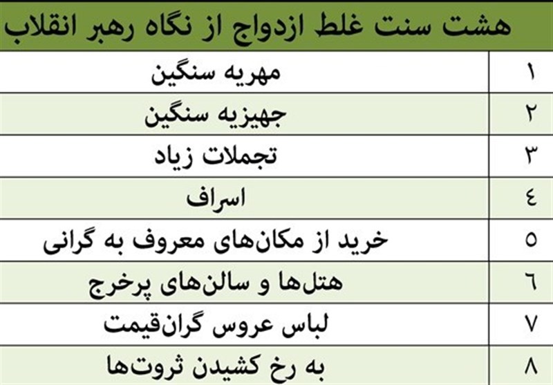 بعضیها سعی میکنند که برای جهیزیه بزنند روی دست همهی قوم و خویشها و همسایهها و دوست و آشناها که این هم غلط است... باید نگاه کنید ببینید که چه چیزی درست است، چه چیزی حق است آن را انجام بدهید. چه چیزی حق است؟ یک خانوادهی دو نفره یک وسایلی لازم دارند که یک زندگی سادهای داشته باشند.