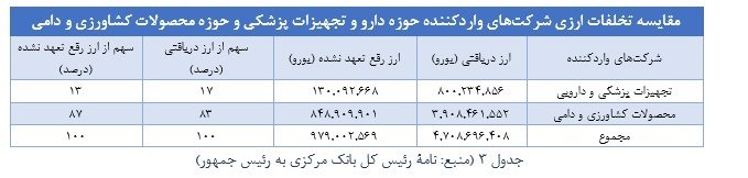 درخصوص تخلف صورت گرفته نیز، از مجموع 1 میلیارد یورو ارز دولتی رفع تعهد نشده، 87درصد از آن یعنی معادل849 میلیون یورومتعلق به شرکتهای واردکنندۀ محصولات کشاورزی و دامی میباشد و صرفاً 13درصد از آن یعنی معادل 130 میلیون یورو مربوط به شرکتهای دارویی و تجهیزات پزشکی است (شکل شمارۀ 2).
