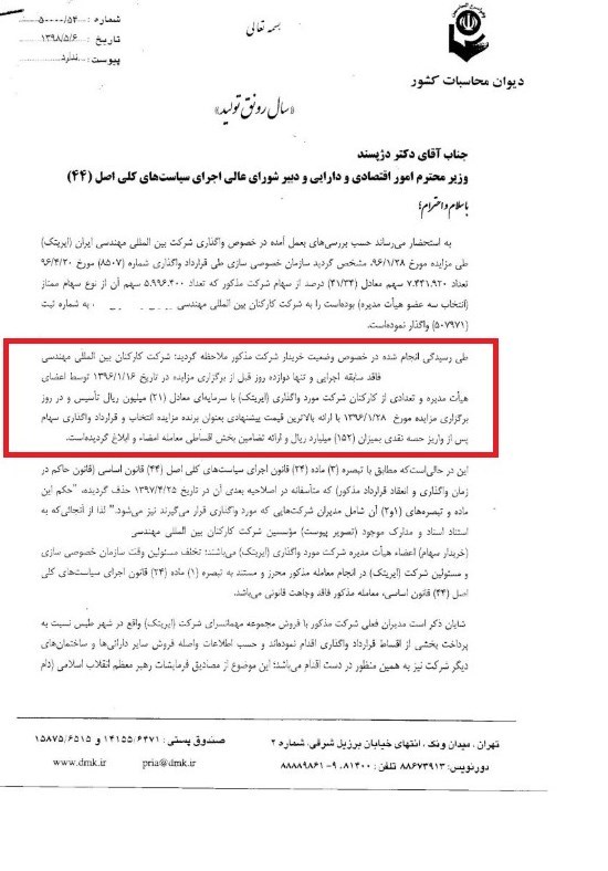 در نامه ارسالشده توسط بیتعفری معاون فنی و حسابرسی امور اقتصادی و زیربنایی دیوان محاسبات کشور به دژپسند وزیر اقتصاد، آمده است که شرکت ایریتک به شرکت ... واگذار شده که فاقد سابقه بوده و تنها دوازده روز پیش از برگزاری مزایده (96.1.16) و با سرمایه دو میلیون و 100 هزار تومان (معادل 21 میلیون ریال) تأسیس شده است.
