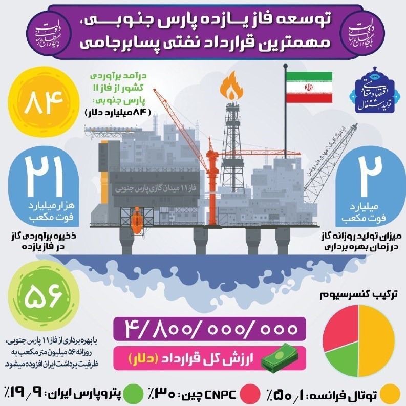 تصویر بالا، اینفوگرافیگی است که پایگاه اطلاعرسانی دولت تیرماه سال 96، درست بعد از امضای قرارداد توسعه فاز 11 پارس جنوبی منتشر کرد و از درآمدزایی 84 میلیارد دلاری توسعه این فاز (در مدت 20 سال قرارداد) برای ایران خبر داد.
