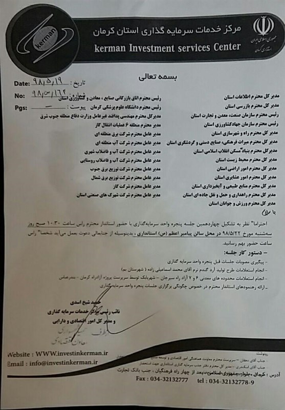 استاندار کرمان در ابتدای جلسه پنجره واحد خدمات سرمایهگذاری استان کرمان عذر دستگاههایی را که مدیر آن در جلسه حضور نداشتند را خواست و گفت: دستگاههایی که مدیر آن در جلسه حضور ندارند از سالن خارج شوند و از نظر ما عدم حضور مدیر در این جلسه قابل قبول نیست.