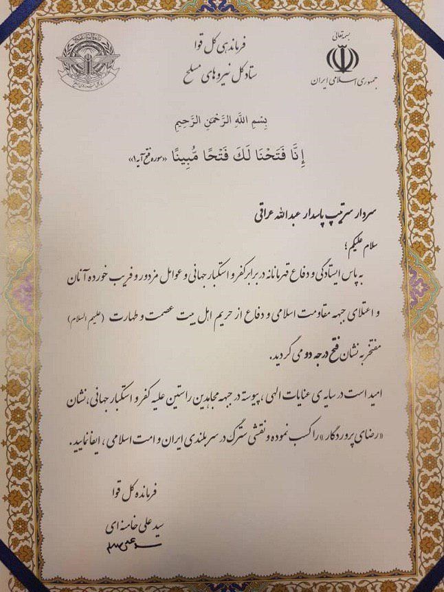به گزارش گروه دفاعی خبرگزاری تسنیم، صبح امروز(دوشنبه، 28 مرداد) و در مراسم تقدیر از خانواده شهدای مدافع حرم سردار سرتیپ پاسدار عبدالله عراقی رئیس اداره امنیت ستاد کل نیروهای مسلح، به پاس ایستادگی و دفاع قهرمانانه در برابر کفر و استکبار جهانی و عوامل مزدور و فریبخورده آنان و همچنین اعتلای جبهه مقاومت اسلامی و دفاع از حریم اهل بیت عصمت و طهارت(ع) به دریافت نشان درجه دو فتح از سوی فرماندهی معظم کل قوا حضرت آیتاللهالعظمی خامنهای مفتخر شد.