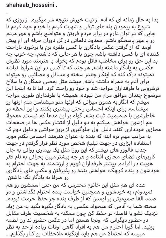 شهاب حسینی با پیامی در صفحه اینستاگرامی خود نسبت به انتشار یک عکس سلفی با هوادار خانم در خارج از کشور واکنش نشان داد.
