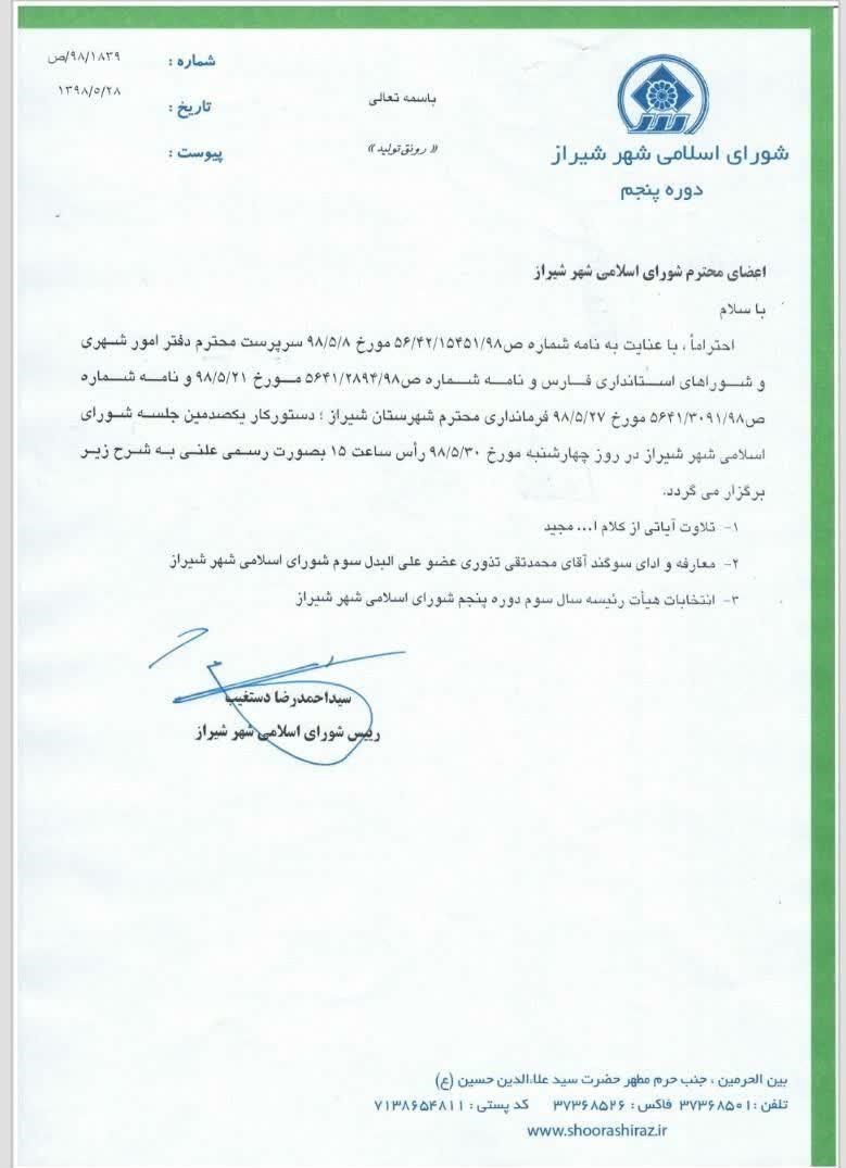 وی افزود: پس از ارائه توضیحات اعضای شورا و با توجه به اعلام شفاهی و نامه ی مکتوب شورا در روز دوشنبه مورخ 98/05/28، مبنی بر خودداری رییس شورا از امضای صورتجلسه و دعوتنامه، خدشه ای بر انتخابات هیئت رییسه جدید وارد نیست.