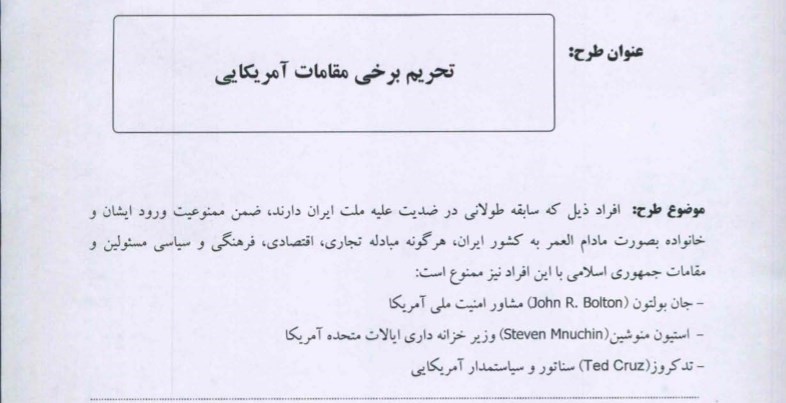 متن کامل طرح نمایندگان مجلس شورای اسلامی برای تحریم مقامات دولت آمریکا بهشرح زیر است: