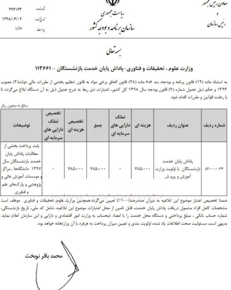 به گزارش خبرگزاری تسنیم، محمدباقر نوبخت معاون رئیس جمهور و رئیس سازمان برنامه و بودجه دستور تخصیص مبلغ 785 میلیارد ریال برای پرداخت پاداش پایان خدمت بازنشستگان وزارت علوم، تحقیقات و فناوری را صادر کرد.