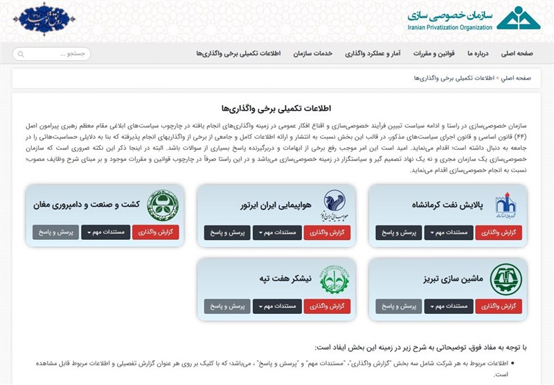 همچنین اطلاعات مربوط به هر شرکت شامل سه بخش "گزارش واگذاری"، "مستندات مهم" و "پرسش و پاسخ" میباشد که با کلیک بر روی هر عنوان گزارش تفصیلی و اطلاعات مربوط قابل مشاهده است.