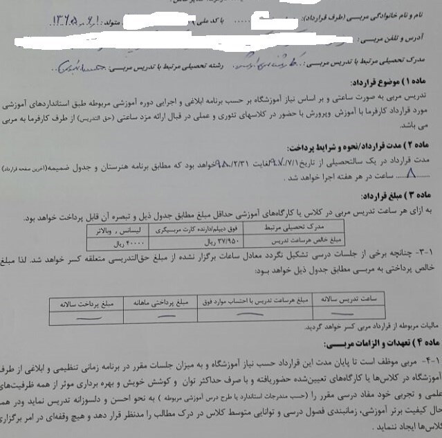 مربی دیگری که 6 سال است در حال آموزش مهارت در هنرستان است و لیسانس آی تی دارد، میگوید: روزی 70 کیلومتر مسیر میروم تا به هنرستان برسم و هفتهای 50 ساعت تدریس دارم با ساعتی 4 هزار تومان! به ازای یک سال باید 6 میلیون تومان برایم واریز میکردند اما 4.5 میلیون تومان ریختند، حق اعتراض هم نداریم چون اگر اعتراض کنیم برای سال تحصیلی آینده به ما اجازه آموزش در هنرستان را نمیدهند و هنوز از سال سوم فعالیتم طلب دارم اما شرکت پرداخت نکرده است، چند بار درباره وضعیتمان به نمایندگان مجلس نامه نوشتم اما هیچ اقدامی نکردند! متأسفانه ما گروهی هستیم که فراموش شدهایم نه سازمان فنیوحرفهای و نه آموزشوپرورش خود را مسئول رسیدگی و نظارت بر قراردادی که با منعقد میشود، میدانند.به دلیل اینکه پول پرداختی از فعالیت در هنرستان پاسخگوی هزینههای زندگی نیست در مزرعه کشاورزی میکنم، ازدواج کردهام و دو فرزند دارم و بخشی از خرج زندگیم را هنوز پدرم تأمین میکند!