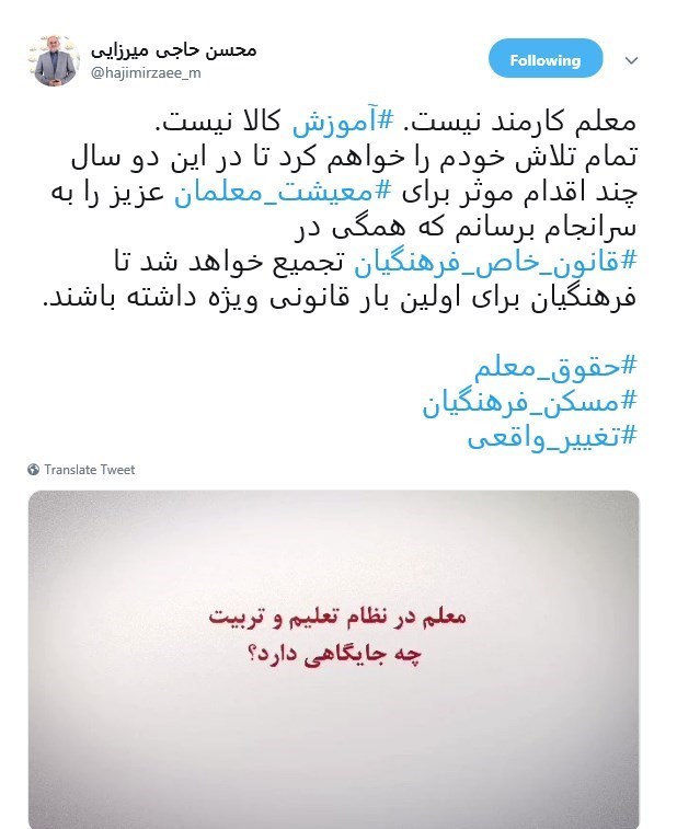 به گزارش خبرنگار اجتماعی خبرگزاری تسنیم، محسن حاجیمیرزایی گزینه پیشنهادی دولت برای تصدی وزارت آموزشوپرورش در صفحه شخصی خود در تویتر درباره معلم و آموزش نوشت: "معلم کارمند نیست، آموزش، کالا نیست.