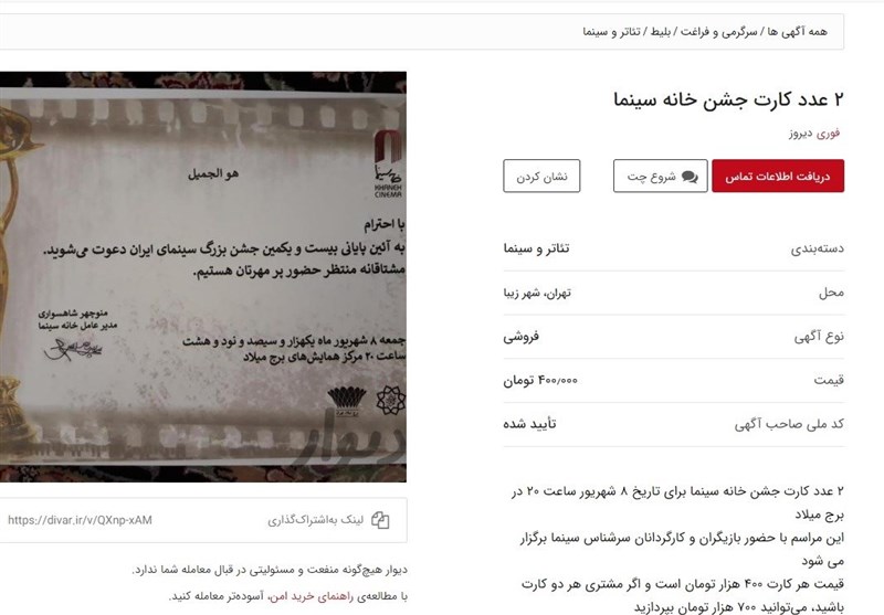 کارتهای جشن خانه سینما بهتعداد بالا روی سایتهای اینترنتی برای فروش گذاشته شده و قیمتهای درنظر گرفتهشده برای این کارتها از 200 هزار تومان تا 500 هزار تومان بود.