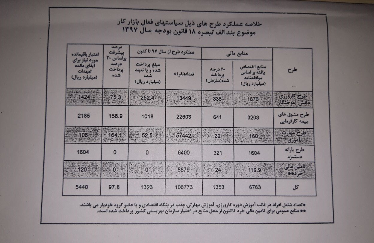طرح مهارتآموزی نیز از دیگر طرحها است که حدود 160 میلیارد ریال منابع اختصاصیافته بر اساس موافقتنامه بود که از ابتدای سال 97 تا مرداد 98 حدود 52.5 میلیارد ریال از آن پرداخت شد و حدود 108 میلیارد ریال آن هنوز پرداخت نشده است.