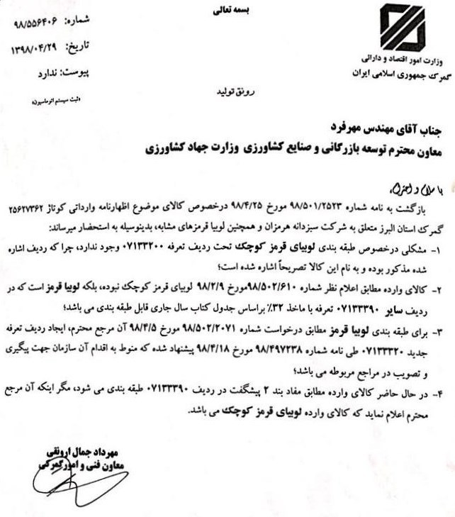 بر این اساس، چندی قبل نیز مکاتبهای از سوی معاون گمرک ایران با معاون توسعه بازرگانی وزارت جهاد برای تعیین تکلیف محمولههای لوبیای وارداتی صورت گرفته بود.
