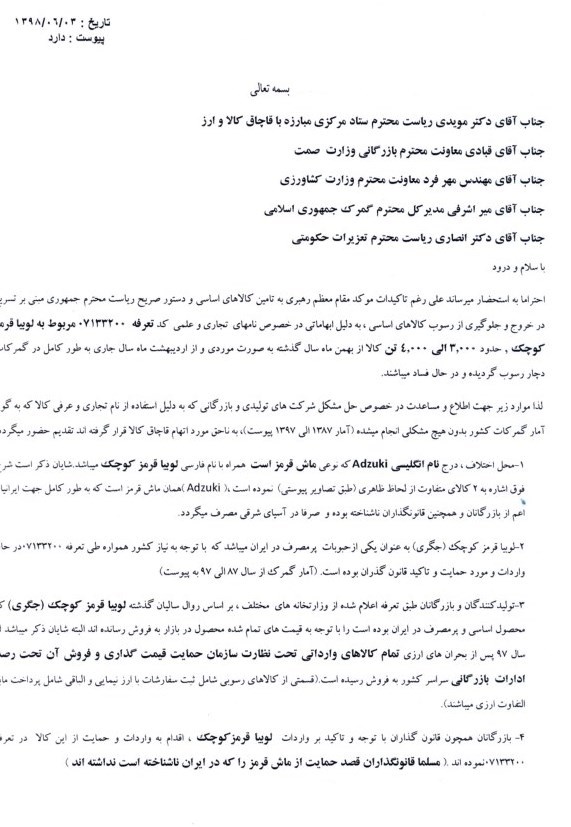 متن این مکاتبه با رئیس ستاد مبارزه با قاچاق کالا، معاون بازرگانی صمت، معاون جهاد کشاورزی رئیس تعزیرات حکومتی و رئیس گمرک در ادامه قابل مشاهده است.