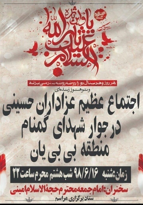 در این برنامه که در جوار تربت پاک دو شهید گمنام منطقه بیبییان مسجدسلیمان برگزار میشود حجتالاسلام والمسلمین محمدصادق امینی امام جمعه این شهر سخنرانی میکند و مداحان اهل بیت عصمت و طهارت(ع) نیز به نوحهخوانی و مرثیهسرایی میپردازند.