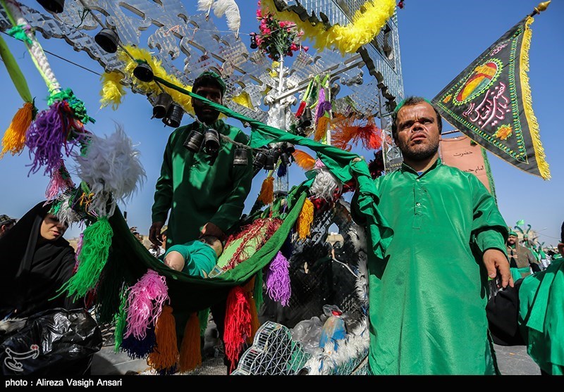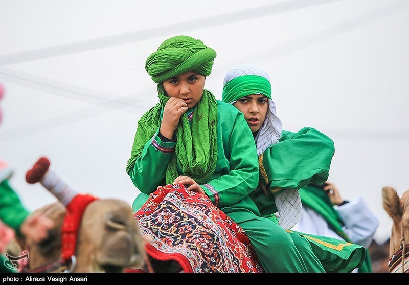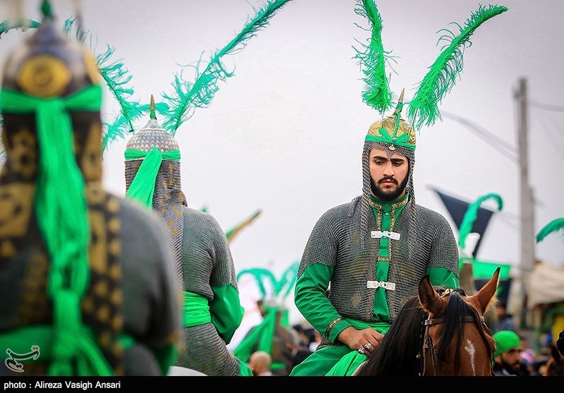 اول از همه سالار شهیدان، سپس سقای آب و ادب، و بعد تازه داماد کاروان، سوار بر مرکب داخل میشوند؛ پر شالشان خنجر و بر گردن اسبهایشان پارچه سبز. کودکان قافله هرکدام لباسی به تن دارند، یکی سفید پوشیده و دیگری ردایی سیاه.