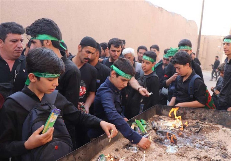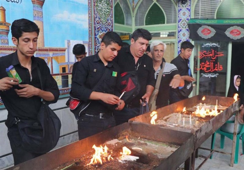 وقتی که زن و مرد با در دست داشتن دستههای شمع و البته شمعهای قدی را گماشتگان بانوان و آقایان در دست داشتند و بیشتر هم آقایان رجال با پای برهنه با همسر و فرزندانشان حرکت میکردند همین که وارد مثلا منزل سادات اخوی میشدند شمع قدی و غیرقدی را هر چند که در نظر می گرفتند و در جایی که مقداری گل پهن کرده که شمع پابرجا و ثابت سرپای خود باشد، روشن میکردند ... ».