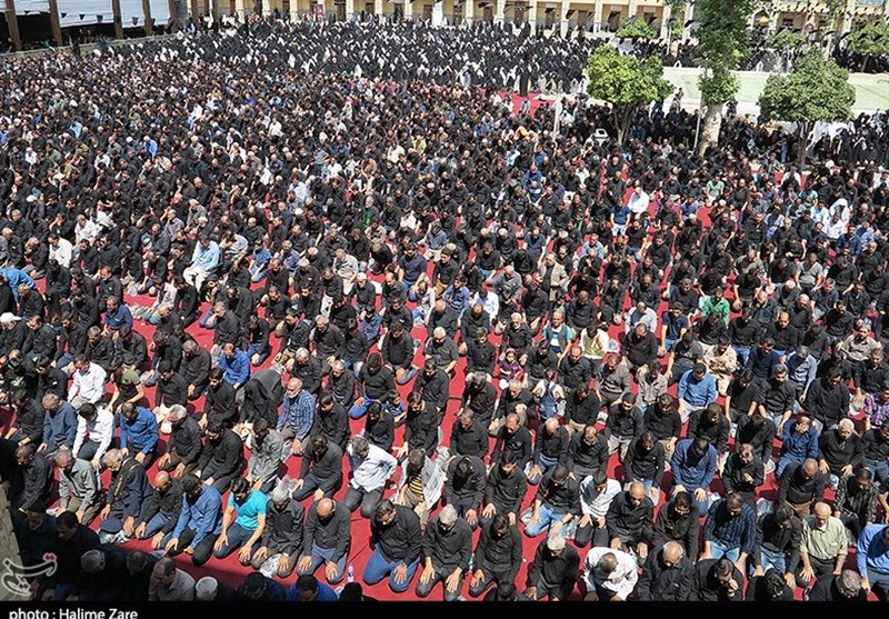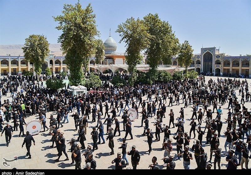 با اذان ظهر هیئات مذهبی حاضر در صحن شاهچراغ(ع) به اقامه نماز ظهر عاشورا پرداختند.