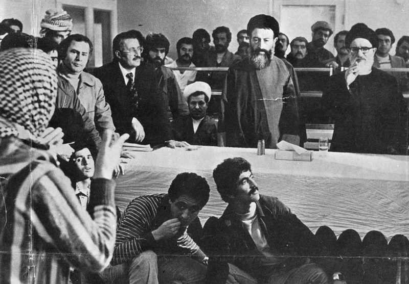 آیتالله طالقانی در سفر به کردستان در حال گفتوگو با نمایندگان احزاب و گروههای کرد