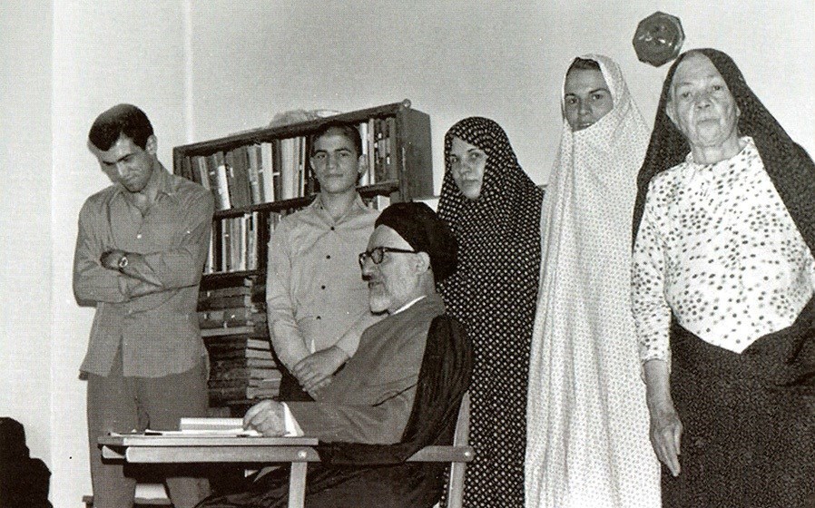از راست به چپ: مادرِهمسر آیتالله طالقانی، وحیده، بتولخانم (مادر وحیده)، آیتالله طالقانی، مجتبی و مهدی طالقانی