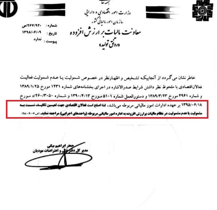 همچنین در متن مکاتبه ابراهیم بیگی مدیر کل دفتر فنی و اعتراضات مودیان مالیاتی آمده است، در صورت پرداخت مالیات و عوارض هنگام خرید کالاهای مشمول از فعالان خارج از منطقه، مبالغ(مالیات و عوارض پرداختی) قابل استرداد نبوده و فقط جزء هزینههای قابل قبول برابر قانون مالیاتهای مستقیم تلقی خواهد شد.