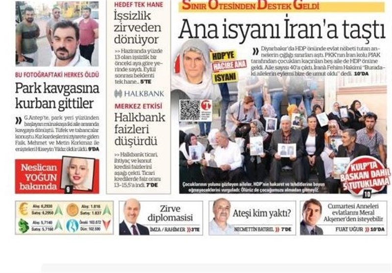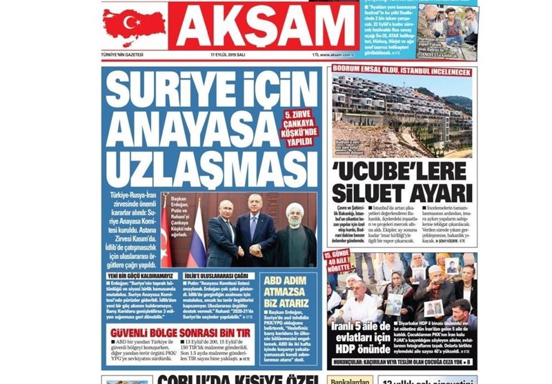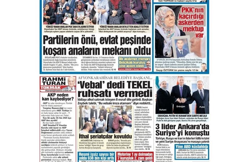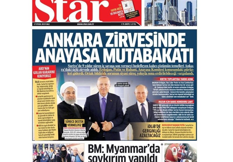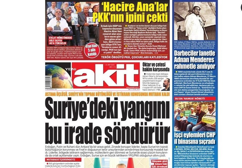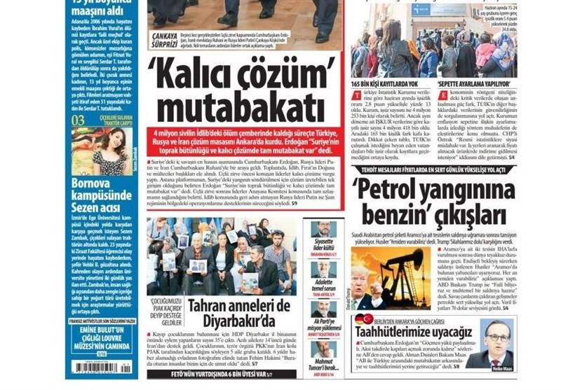 به گزارش گروه بینالملل خبرگزاری تسنیم، بسیاری از روزنامههای ترکیه، امروز در عکس و تیتر صفحه نخست، نشست سه جانبه روحانی٬ اردوغان و پوتین را برجسته کردهاند. این روزنامهها همچنین حضور 5 خانواده کُرد ایرانی در جمع معترضین به پ.ک.ک در شهر دیاربکر ترکیه را مورد توجه قرار دادهاند.