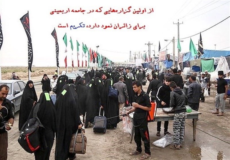 از اولین گزاره‌هایی که در جامعه اربعینی برای زائران نمود دارد، تکریم است؛ واژه تکریم در لغت به معنای گرامی داشتن، احترام کردن و نیکویی رساندن به انسان است و در اصطلاح، برخوردها، رفتارها و روابط مبتنی بر ارج نهادن انسان‌ها به یکدیگر را تکریم گویند؛ این خصلت، همان گزاره‌ای است که خداوند انسان را به آن آراست، آنجا که فرمود «وَ لَقَدْ کَرَّمْنا بَنی آدَمَ وَ حَمَلْناهُمْ فِی الْبَرِّ وَ الْبَحْرِ وَ رَزَقْناهُمْ مِنَ الطَّیِّباتِ وَ فَضَّلْناهُمْ عَلی کَثیرٍ مِمَّنْ خَلَقْنا تَفْضیلاً؛  به راستی ما فرزندان آدم را گرامی داشتیم و آنان را در خشکی و دریا نشاندیم و از چیزهای پاکیزه به ایشان روزی دادیم و آنها را بر بسیاری از آفریده‌های خویش برتری دادیم.» (اسراء70)