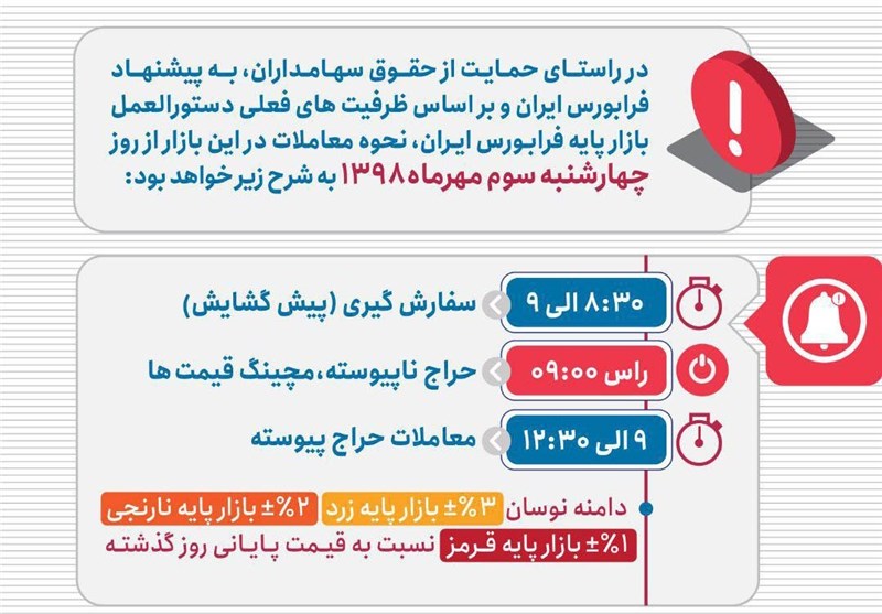 بر این اساس از روز چهارشنبه این هفته (3 مهر) تعداد حراج در تمامی تابلوهای بازار پایه بهتعداد روزهای کاری در هفته و با رعایت دامنه نوسان مجاز هر یک از تابلوها (محدوده دامنه نوسان 3 درصد در تابلو پایه زرد، دو درصد در تابلو پایه نارنجی و یک درصد در تابلو پایه قرمز نسبت به قیمت پایانی در روز قبل) طبق سازوکار حراج روزانه در بازار اول و دوم افزایش مییابد.