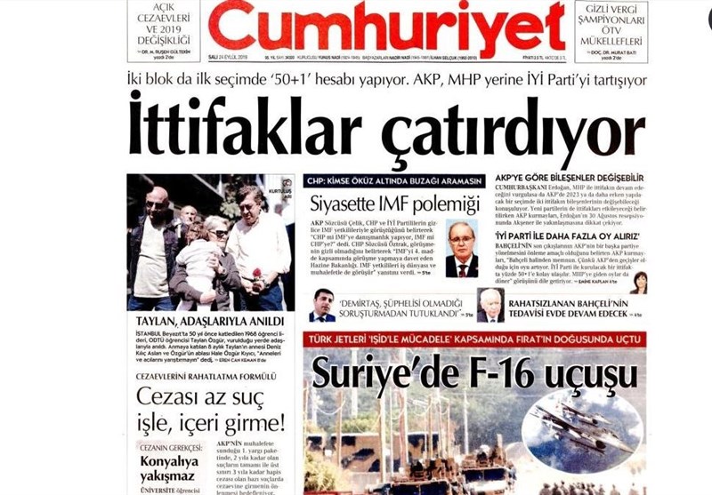 به گزارش گروه بینالملل خبرگزرای تسنیم، بسیاری از روزنامههای ترکیه، امروز در عکس و تیتر صفحه نخست، تحولات شمل سوریه و همچنین بیمار شدن دولت باغچلی رهبر حزب حرکت ملی را برجسته کردهاند.