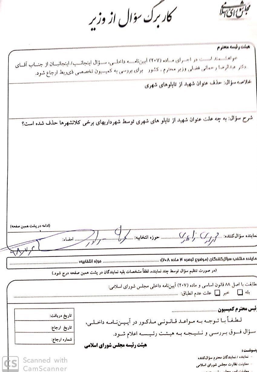 محمد مهدی زاهدی نماینده کرمان در مجلس شورای اسلامی نیز در گفتگو با تسنیم، از طرح سئوال خود از رحمانی‌فضلی وزیر کشور درباره حذف نام شهید از سوی شهرداری‌های در برخی کلانشهرها در معابر شهری خبر داد و گفت: این سوال تقدیم هیئت‌رئیسه مجلس شده است تا به کمیسیون تخصصی برای بررسی بیشتر ارجاع شود.