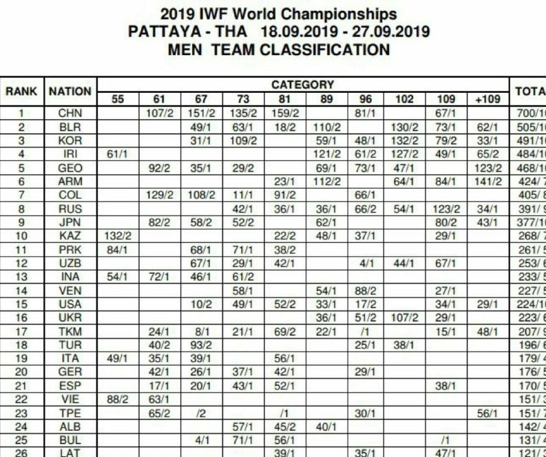 به گزارش خبرنگار ورزشی خبرگزاری تسنیم، تیم ملی وزنهبرداری با 10 وزنه بردار در مسابقات قهرمانی جهان تایلند شرکت کرده بود که در پایان به علت اینکه کیانوش رستمی و محسن دادرس اوت شدند، شانس حضور ایران بر روی سکو از ما گرفته شد و در نهایت با484 امتیاز تیم ایران در رده چهارم قرار گرفت.