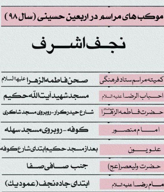 مراسمهای این کمیته در نجف اشرف در صحن فاطمه الزهر(س)، مسجد شهید آیتالله حکیم موکب احباب الرضا(ع)، شارع حیدر کرار روبروی مسجد شاکری موکب حضرت فاطمه الزهرا(س)، کوفه روبروی مسجد سهله موکب امام منصور، بعد از مسجد حکیم ابتدای شارع کوفه موکب علویون، جنب صافی صفا موکب حضرت ولیعصر(عج) و ابتدای جاده نجف(عمود یک) موکب امام رضا(ع) برگزار خواهد شد.