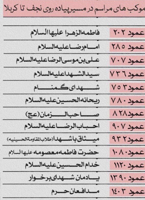 همچنین در مسیر پیادهروی نیز برنامههای این کمیته در عمود 202 موکب فاطمه الزهرا(س)، در عمود 285 موکب امام رضا(ع)، در عمود 707 موکب علی بن موسی الرضا(ع)، در عمود 736 موکب سیدالشهدا(ع)، در عمود 753 موکب شهدای گمنام، در عمود 780 موکب ریحانه الحسین(س)، در عمود 828 موکب صاحب الزمان(عج)، در عمود 907 موکب احباب الرضا(ع)، در عمود 932 موکب میثاق با شهدا(طلاب المقاومه الحسینیه)، در عمود 1080 موکب حضرت فاطمه معصومه(س)، در عمود 1120 موکب خدام الحسین(ع)، در عمود 1390 موکب یادمان شهدای برخوار و در عمود 1403 موکب مدافعان حرم برگزار میشود.